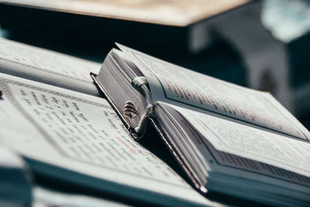 Open Bible in church. Shallow depth of field.
