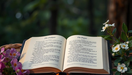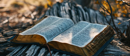 Open bible in the garden, Christian concept.