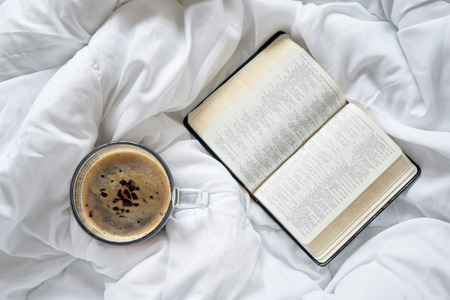 Open bible in hands close-up, concept of calmness and morning solitude.