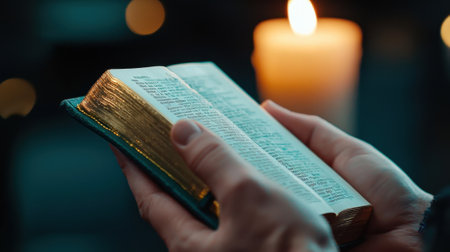 A person is holding a book and a candle. The candle is lit and the book is open to a page with a word on it. Scene is calm and peaceful, as the person is reading in a quiet setting