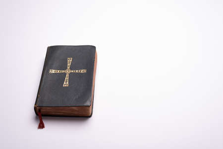 Old Holy Bible on plain white background desk with copy space for text, design, timetable, wedding, communion schedule, masses, catechism classes or catechesis