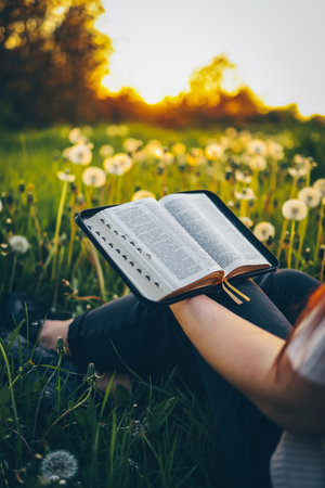 Christian woman holds bible in her hands. Reading the Holy Bible in a field during beautiful sunset. Concept for faith, spirituality and religion. Peace, hope.