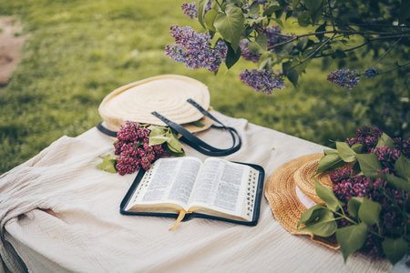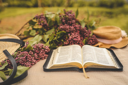 Open bible in the garden and lilac, concept.