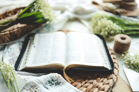 Open bible in spring interior, good morning concept.