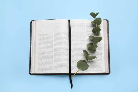 Open Holy Bible and eucalyptus branch on color background