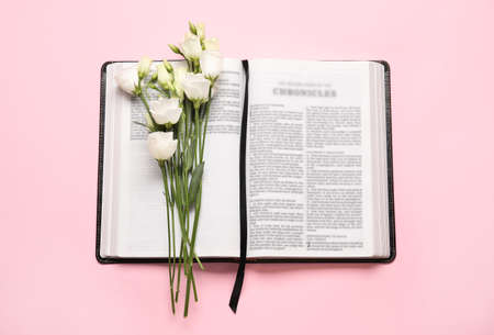 Holy Bible and flowers on color background