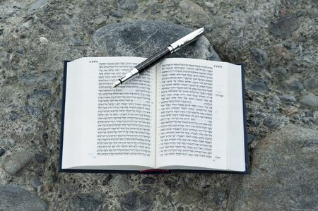 Open Hebrew Bible - TANAKH (Torah, Neviim, Ketuvim - The Law, The Prophets, The Writings) with fountain pen outdoors. Isolated on stones background. Horizontal shot. Close-up.