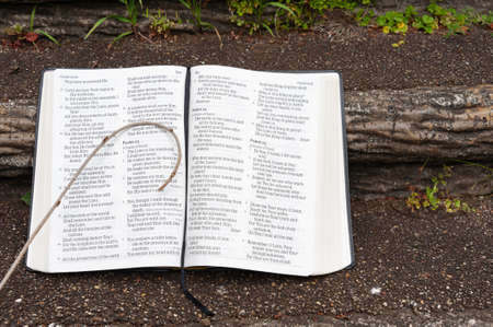 Holy Bible open with small staff on top. Highlighting Psalm 23. Close-up. Copy space. Outdoors on stair step.