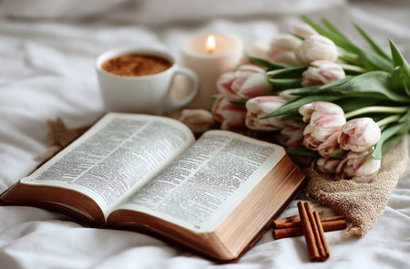 A warm cup of coffee sits beside a bunch of vibrant tulips and open book on soft white bedding, creating a peaceful morning scene perfect for relaxation..