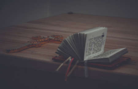 Spirituality, Religion and Hope Concept. Holy Bible and Cross on Desk. Symbol of Humility, Supplication,Believe and Faith for Christian People