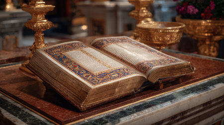 A gold-trimmed Vatican Bible on an altar displays detailed pages, highlighting its significance in the sacred setting.