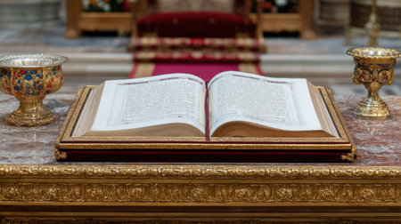 A gold-trimmed Vatican bible lies open on an ornate altar, accompanied by beautifully crafted chalices.