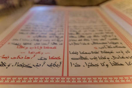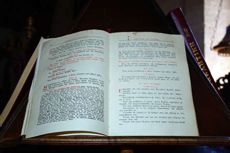 Ana Mera, Greece - September 24, 2019: Holy Book inside Tourliani Monastery, a whitewashed church and monastery on Mykonos dating from the 16th century, with grand dome and religious museum.