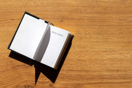 Open Holy Bible on a brown wooden table.Open Holy Bible top view.Religious concept.