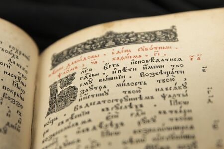 Litography book page. Old initial letter. Open book with beutiful letters. Art illustrated page. Reading of opened book educate reader. Ancient Bible text reading on black background. Russian bible