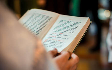 Close-up of priest holding Bible and reading prayers during ceremony in the church