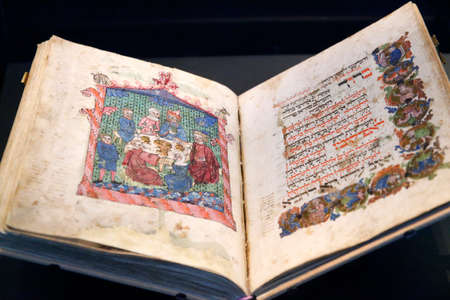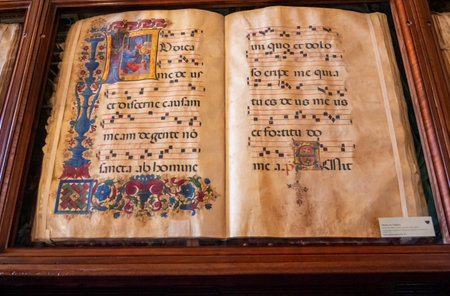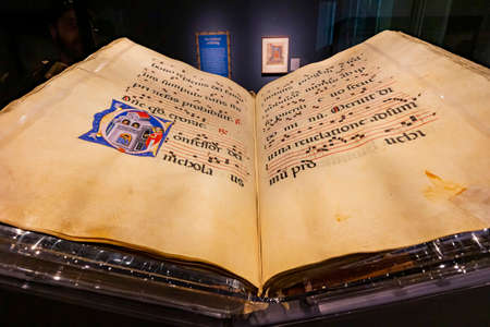 Siena, Italy 02 June 2022 Showcase with colorful painted manuscript codices at Piccolomini library at Cathedral of Siena