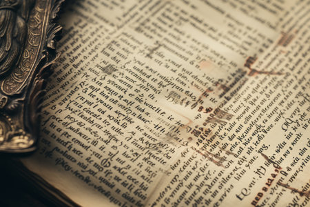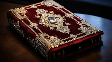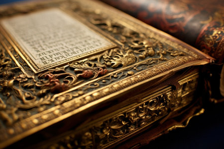 A beautifully embossed Bible on a dark mahogany table, surrounded by antique quills and parchment.