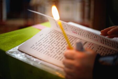 Holy book in hands of a man. Christian Bible. Book with Christian prayers. Concept - reading Christian sermons. Church candles next to hands of a Catholic. Orthodox book with image of cross