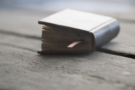 Close up of Christian Holy Bible Old Testament with red book marker on table laced around the top