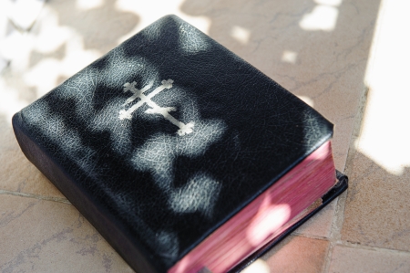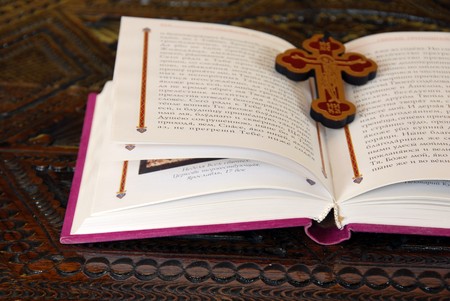 Orthodox cross and the Bible. Shallow depth of field. Focus on the the central part of the cross.