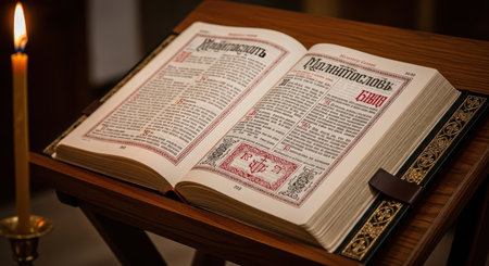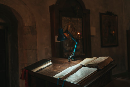 The pulpits or the byzantine ambos in christian orthodox church where scriptures to read. In the foreground the open ancient holy Bible and prayer books in the greek language illuminated by dim of candles light. Greece