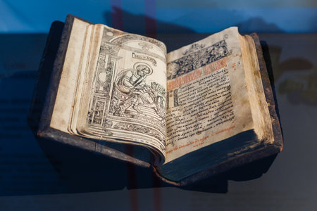 Ukraine, Kiev - February 2, 2020: Interior of exhibition ukraine wow. The Apostle is one of the first printed books in Ukraine in 1574