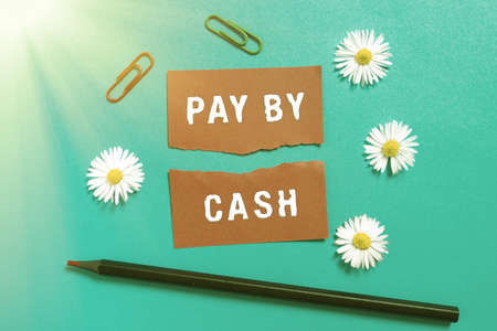 Conceptual caption Pay By Cash. Business showcase Customer paying with money coins bills Retail shopping Ripped Note With New Ideas With Pencil, Flowers And Paperclips Around.