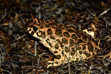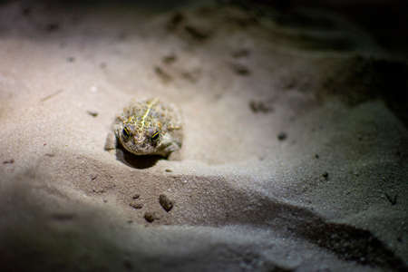 Natterjack toad, Epidalea calamita hiding in the sand of Kalmthout Heath. Night shot.