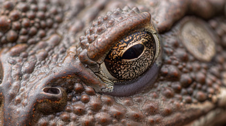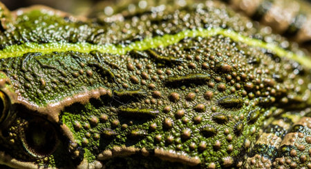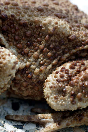 The close-up of the skin surface of a toad with warts, glands and secretions.