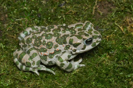European green toad (European Green Toad) wandering on moss in an Italian garden