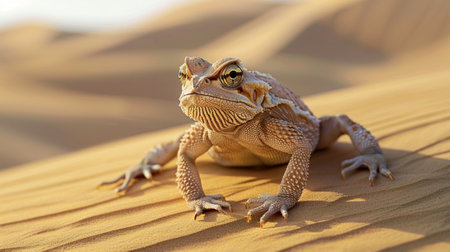 close-up of a desert frog in the middle of sandy dunes, created with generative ai
