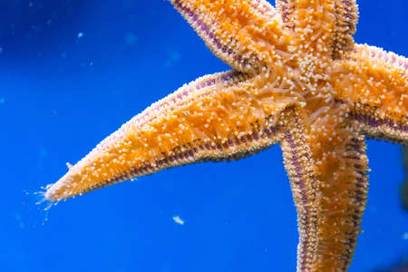 Starfish bottom, tentacles stinging cells on glass, close up view