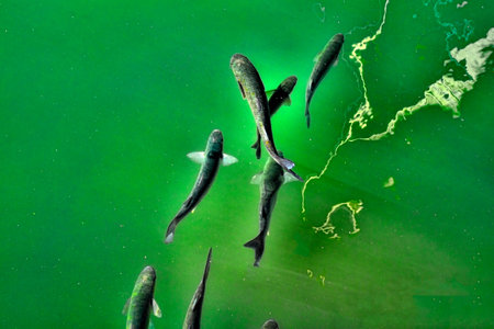 big shoal of common carps swimming together and coming above the water with their mouths, common fish specie from Europe