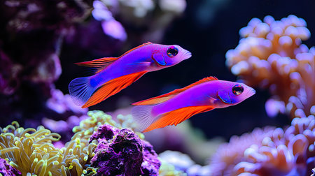 Two vibrant fish swim gracefully among colorful corals, showcasing the beauty of marine life. This serene underwater scene highlights the rich biodiversity of coral reefs.