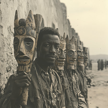 An evocative image featuring traditional African masks held by individuals, set against a historical backdrop. This scene captures a sense of cultural heritage and artistic expression in a timeless setting.