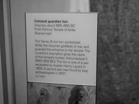 LONDON, UK - CIRCA SEPTEMBER 2019: Colossal guardian lion, Assyrian, about 865 to 860 BC from Nimrud Temple of Ishtar Sharatt-niphi, at the British Museum in black and white
