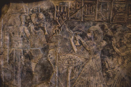 Cairo, Egypt - November 02, 2021: Interesting Ancient Paintings and Engravings with Hieroglyphics symbols in the Cairo Egyptian Museum, the oldest archaeological museum in the Middle East