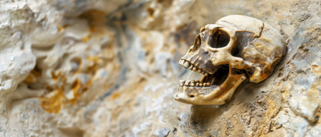 A human skull rests against a rough, weathered rock formation. The skull is in a slightly open-mouthed position, and the details of the teeth and bone are visible. The rough texture of the rock and the contrasting smooth surface of the skull create a visual juxtaposition.