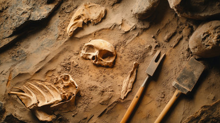 Captivating view of archaeological excavation featuring ancient skeleton remains and tools, revealing insights into human history and culture.