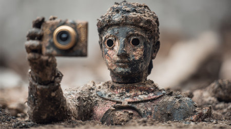 A captivating sculpture depicts a figure with a rusty finish, holding a camera, symbolizing art and photography amidst natural decay.