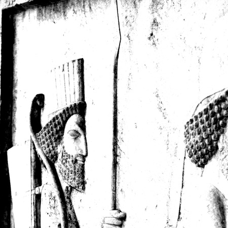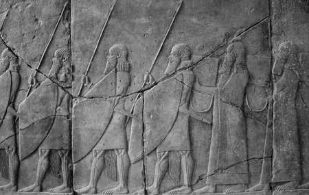 Ancient wall with bas-relief with assyrian warriors with with spears and shields, Persepolis, Iran. site