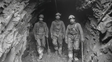 A group of Miners in the mine. Dirty miners in uniform in the mine.
