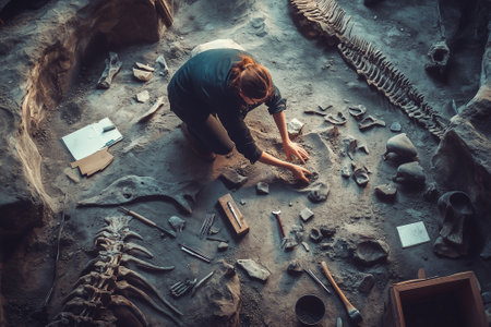 An archaeologist is meticulously studying ancient fossils within a rich and historically significant excavation site. Generative AI