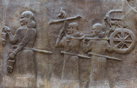 Assyrian wall relief, detail of panorama with royal lion hunt. Old carving from the Middle East history. Remains of culture of Mesopotamia ancient civilization. Amazing Babylonian and Sumerian art.