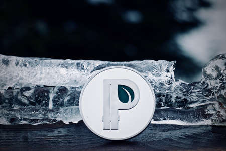 Digital currency physical metal silver peercoin coin. Cryptocurrency snow ice concept.