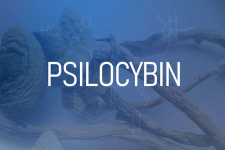 chemical formula of psilocybin on a blackboard Mushroom. Albino A strain. Psychedelic drug. Close up Magic shroom. Psilocybin mushroom. Dry Psilocybe cubensis.