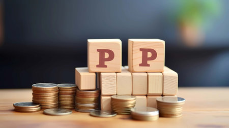 Wooden cubes with PPP abbreviation on the background of coins, Business concept, Generative AI illustrations.