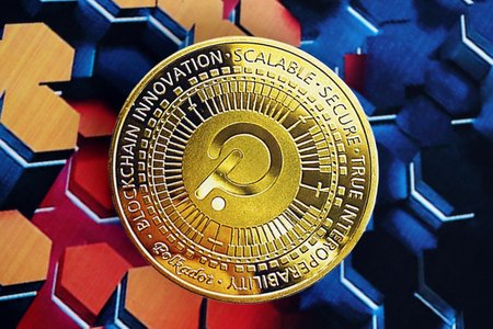 KYIV, UKRAINE - OCTOBER 9, 2025 Polkadot cryptocurrency coin sticker on hexagonal abstract banner. Concept of modern crypto money