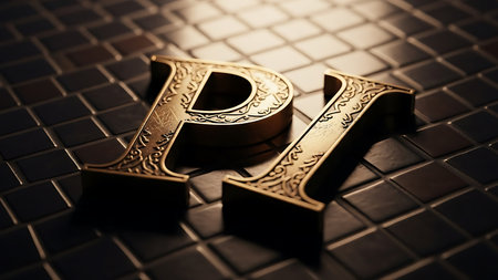 Two metallic gold letters, 'P' and 'I', are rendered in 3D with intricate, classical ornamentation. They rest on a dark, glossy, tiled surface, creating a sense of opulence and sophistication.